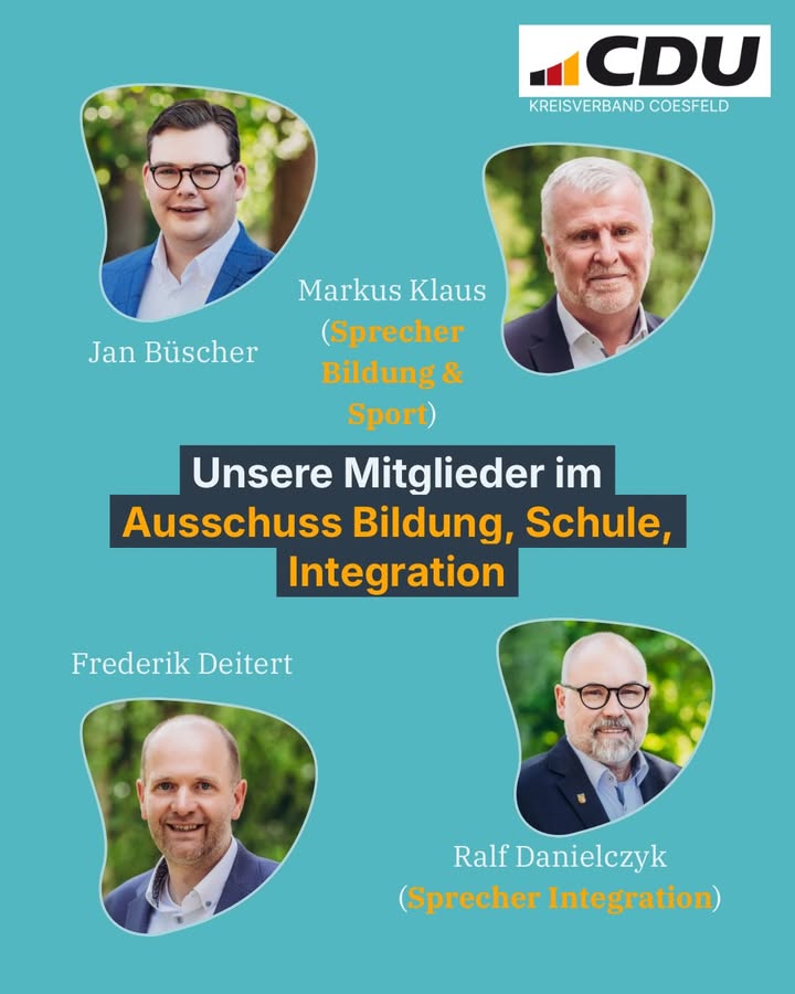 Unsere Mitglieder im Ausschuss Bildung, Schule und Integration. ?💼Die Ausschussbesetzungen stehen fest! 🤝🏻Für euch ein schneller Überblick, wer von uns imAusschuss für Bildung, Schule und Integration sitzt. 💼Die Besetzungen der anderen Ausschüsse findet ihr nach und nach bei uns auf dem Profil! 😍#cdu #cducoe #kreistag #ausschuss#mitglieder