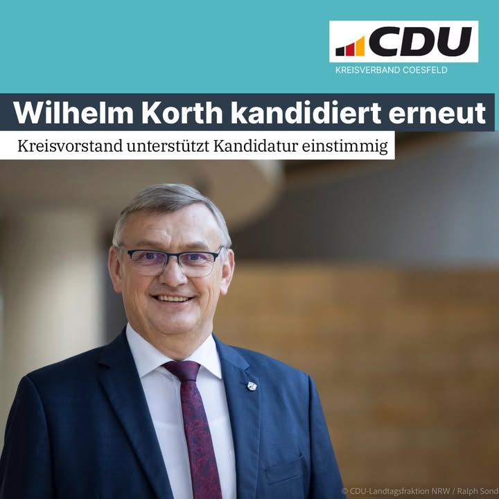 Wilhelm Korth ist der Kandidat des CDU Kreisverbandes Coesfeld im Wahlkreis Coesfeld I - Borken II 👨💼Unser Kreisvorstand hat ihn in der letzten Sitzung einstimmig als Kandidaten für die Landtagswahl 2027 nominiert! 🙌🏻In den letzten Jahren als Landtagsabgeordneter zeigte Wilhelm Korth Engagement für den Wahlkreis, sowie Kompetenz und Politik nah an den Menschen. 💬Die offizielle Kandidatenaufstellung ist Anfang Juni geplant. Dort haben die CDU-Mitglieder des Wahlkreises die endgültige Entscheidung zu treffen! 🚀Die ganze Pressemitteilung findet ihr auf unserer Homepage! 💻#cdu #kandidatur #cducoe #landtagswahl #kreisvorstand