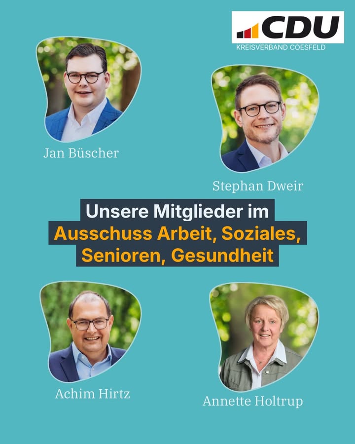 Unsere Mitglieder im Ausschuss Arbeit, Soziales, Senioren und Gesundheit. ?💼Die Ausschussbesetzungen stehen fest! 🤝🏻Für euch ein schneller Überblick, wer von uns imAusschuss für Arbeit, Soziales, Senioren und Gesundheit sitzt. 💼Die Besetzungen der anderen Ausschüsse findet ihr nach und nach bei uns auf dem Profil! 😍#cdu #cducoe #kreistag #ausschuss#mitglieder